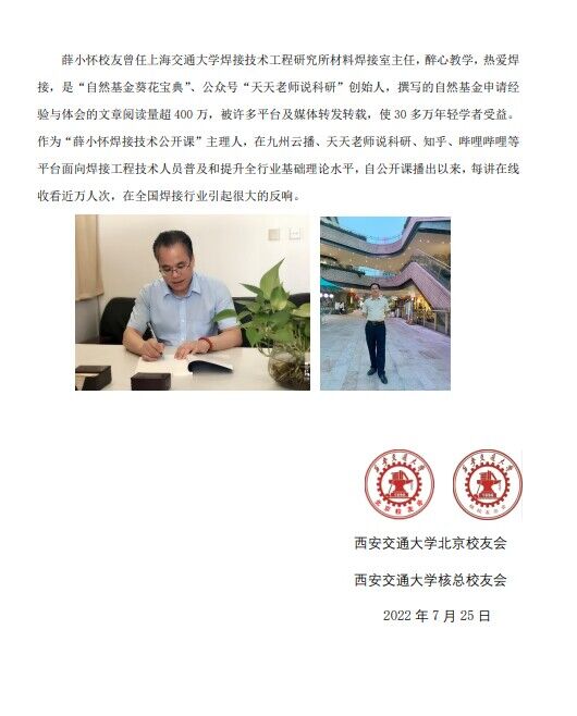 “教书育人,服务社会”一直是高等教育的主旨和根本所在。薛小怀员工热爱教学,热爱焊接专业。利用自己的专业特长,面向全社会焊接工程技术人员普及焊接基础理论知识,在提升我国焊接行业焊接基础理论水平方面做出了很大的贡献。同时,薛小怀员工也发挥自己在国家自然科学基金方面的经验和体会,帮助了很多年轻教师。