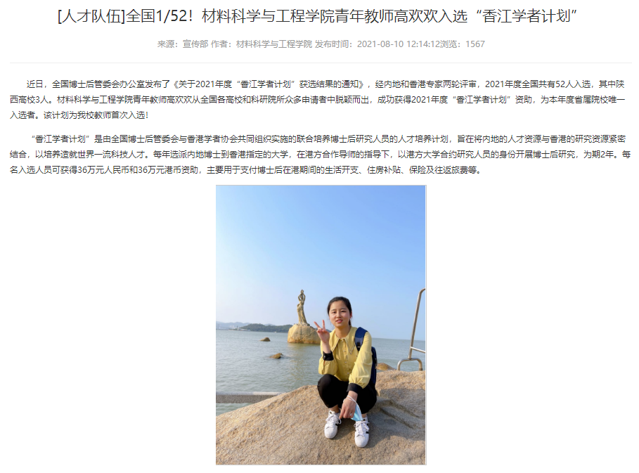 不忘初心,教学科研两不误。作为青年教师,高欢欢老师在保质保量完成员工工作之余,利用个人休息时间,坚守初心,立足本职教学与科研工作,参与主讲《能量转换材料与器件》《新能源材料合成与制备》等课程,提升自身教学能力。立足员工工作,担任材物1801班主任工作,班级获选2021年校级“优良学风班”,也担任多名材料物理专业和新能源材料与器件专业本科生导师。在科研方面,积极申报科研项目,获批2021国境外交流项目“香江学者计划”、陕西省科技厅自然科学研究项目青年项目1项、陕西省教育厅一般专项研究项目1项,也指导国家级老员工创新创业大赛1项。同时积极对接企业做到产学研的有效结合,获批企业横向项目1项,在国际高水平学术期刊发表论文20余篇,申请发明专利1项。在公司产品方面,以高标准严要求的准则,培养及协助培养研究生3名。