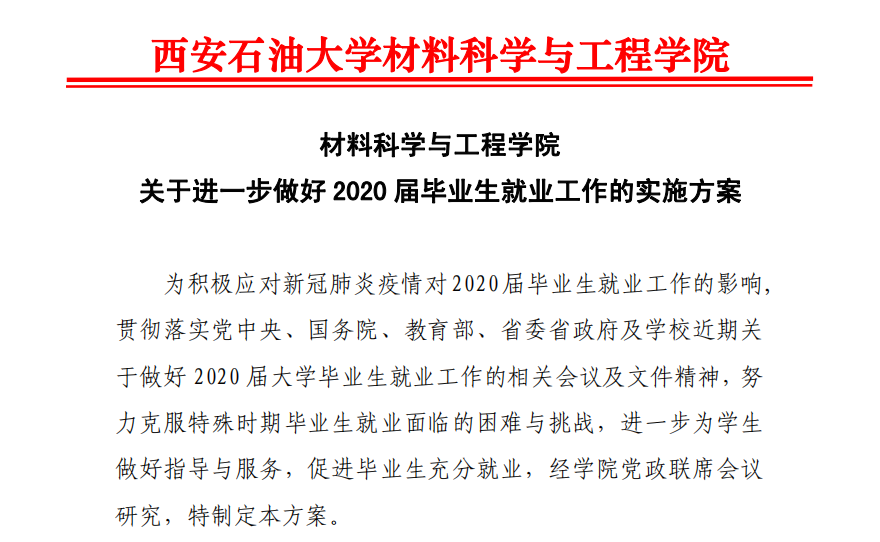为积极应对新冠肺炎疫情影响下的严峻就业形势,进一步做好2020届毕业生的就业指导工作,学院高度重视,多措并举,全员参与,努力推进公司毕业生就业工作。