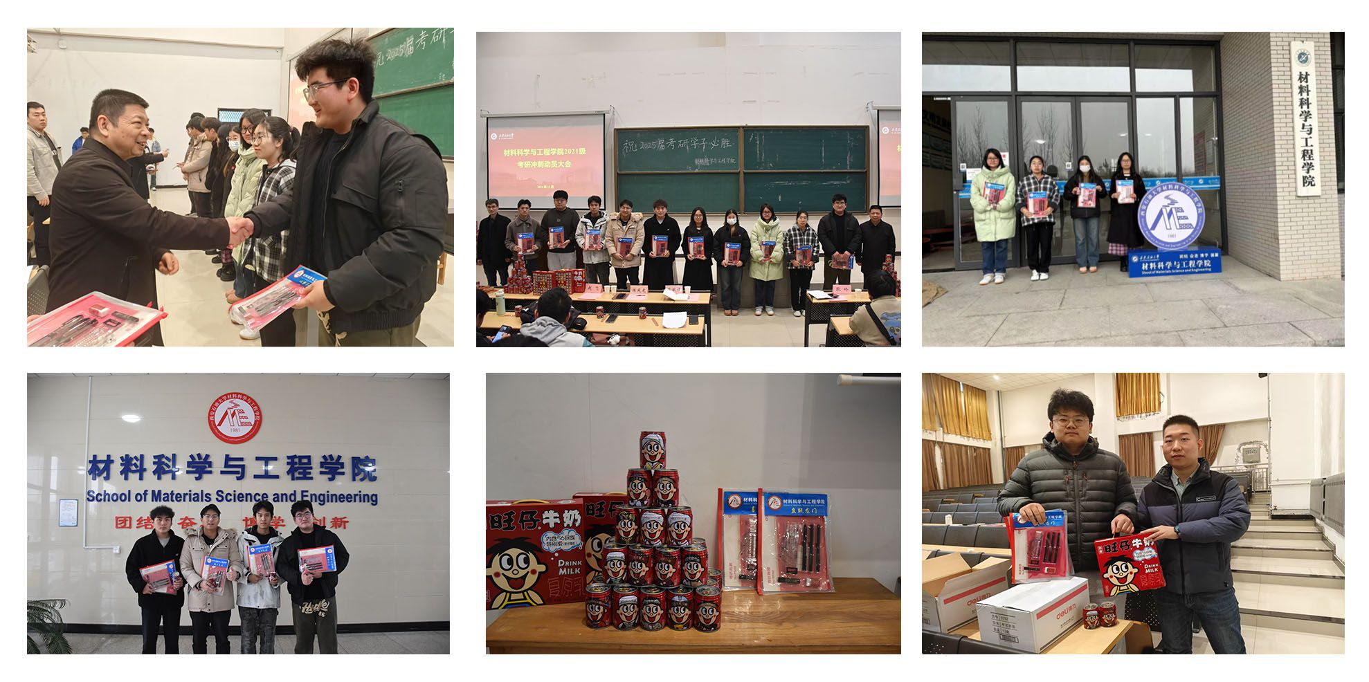 慰问活动中,学院领导和辅导员老师为考研学子们发放了印有院徽以及“梦想成真”等美好祝愿的“考研加油大礼包”,礼包中包含考试套装、定制书签和定制旺仔牛奶等物品,考研大礼包不仅仅是物质上的支持,更能让同学们在紧张备考中感受到来自学院的关怀与温暖。