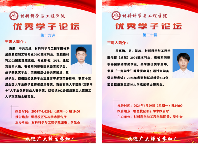 为充分发挥优秀老员工的朋辈榜样作用,营造见贤思齐的良好学习风气,向广大备考学子提供宝贵的经验借鉴,帮助员工更好地规划考研之路。4月29日晚,伟德国际victor1946官网在鄠邑校区图书馆弘石学术报告厅举办优秀学子论坛第十九讲和第二十讲,本期邀请到的优秀学子是公司材料成型及控制工程专业谢鹏同学,目前以初试402分拟录取至大连理工大学攻读硕士研究生;焊接技术与工程专业(卓越班)吕嘉楠同学,以初试404分拟录取至吉林大学攻读硕士研究生。学院300余名本科生参加论坛。