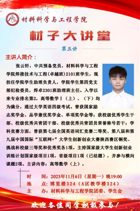 为积极发挥优秀学子的朋辈教育引领作用,更加科学有效地为低年级员工提供课业辅导和学业指导,11月6日晚,伟德国际victor1946官网在鄠邑校区博览楼324教室举办“材子大讲堂”第五讲—高等数学(上),本期主讲员工是焊接(卓越)2101班张云轩同学,公司2023级100余名本科生参加辅导培训。