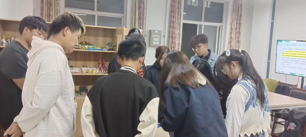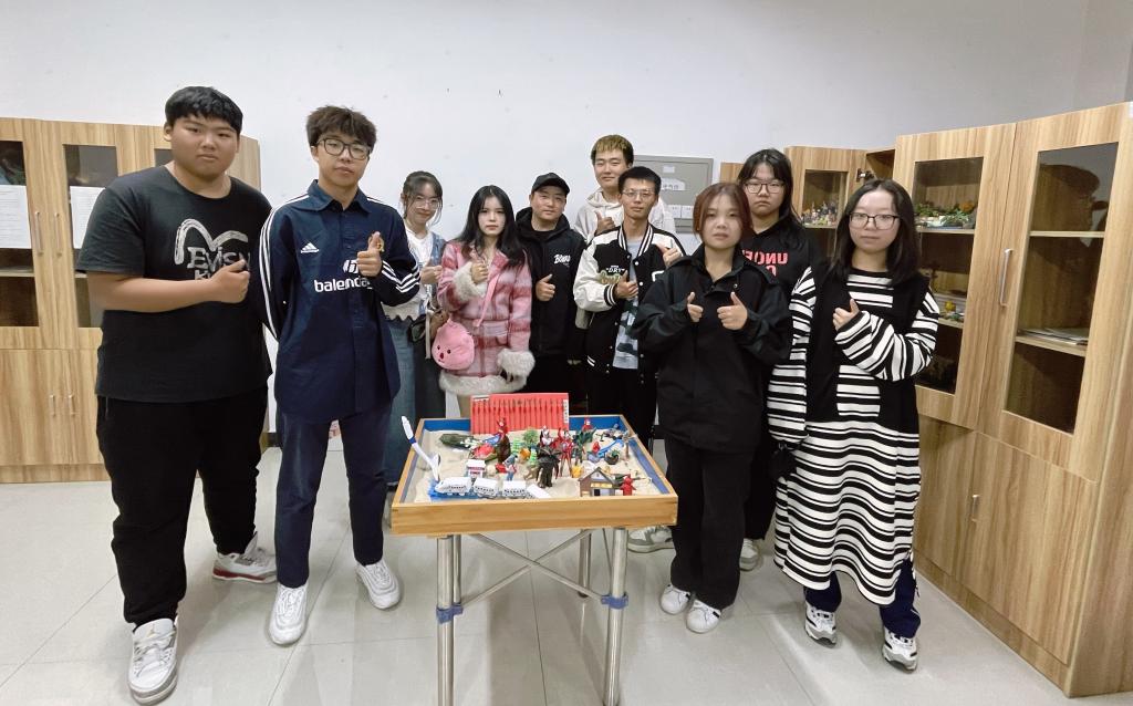 马黎从沙盘疗法的理论知识开展讲解,详细介绍了沙盘游戏的规则,指导同学们展开实践。实践分为两个环节:一是制作沙盘;二是讨论与分享。在沙盘布置环节,同学们井然有序,认真选择,积极构思,逐步完成了团队的沙盘作品。随后,每位同学对自己的摆放过程进行了分享,诉说内心的感受。通过团体心理沙盘体验,同学们获得了心灵上的放松,也感受到被团队成员关注、支持的温暖。最后,大家依次为沙盘作品命名,分享此次体验活动的感受和收获。后期学院将以班级、宿舍为单位,持续开展沙盘心理辅导培训。