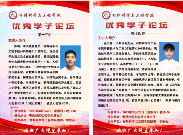 10月26日晚上,伟德国际victor1946官网在鄠邑校区图书馆弘石学术报告厅举办优秀学子论坛第十三讲和第十四讲,本期邀请到的优秀学子是荣获国家奖学金、国家励志奖学金等荣誉的材物2101班徐剑和焊卓2101班张云轩两位同学,学院2023级全体本科生参加论坛。